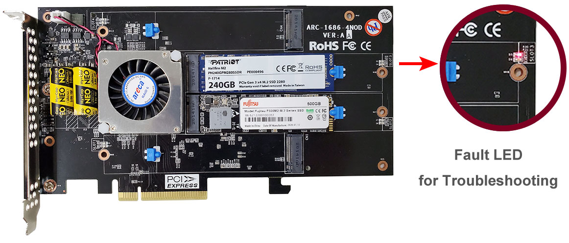 On-board Supercapacitor keeps M.2 fault LED status to easy identify failed drive when ARC-1686 RAID adapter removes from the system PCIe slot. |